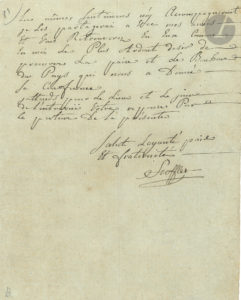 Nicolas STOFFLET (1751-fusillé 1796) Général de la Vendée. — L.S., Neri 30 fructidor III (16 septembre 1795), au Général Hoche ; la lettre est écrite par l’abbé Étienne-Alexandre Bernier (1762-1806) ; 2 pages petit in-4. —