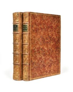 [Hancarville (Pierre-François-Hugues d')]. Ensemble de 2 volumes grand in-4 en reliure homogène, veau écaille, dos à nerfs cloisonnés et fleuronnés avec pièces de titre vert sombre, triple filet doré encadrant les plats avec fleurons d'angles, coupes ornées, roulette intérieure dorée, tranches dorées ; dos passés, accroc à un mors, coupes un peu frottées (reliure de l'époque). Éditions originales, en premiers tirages. — Monumens de la vie privée des douze Césars, d'après une suite de pierres gravées sous leur règne. À Caprées, chez Sabellus, 1780. In-4, xii-196 pp. Tirage avec titre à 11 lignes et texte à « s » longues, le seul « à préférer » (Cohen / De Ricci, col. 475). Illustration libre gravée sur cuivre hors texte : titre-frontispice, et 50 planches numérotées 1 à 50. — Monumens du culte secret des dames romaines, pour servir de suite aux Monumens de la vie privée des XII Césars. Ibid. In-4, xxvii-(une blanche)-98 pp. ; titre à la date de 1780, avec texte à « s » longues et citations latines sans traductions. Illustration libre gravée sur cuivre hors texte : titre-frontispice, et 50 planches numérotées 1 à 50. Avec quelques gravures sur bois dans le texte, dont une libre au titre. Réinvention érudite de l'iconographie érotique au prisme du libertinage du xviIie siècle : le baron d'Hancarville entretient dans les présents Monuments la fiction d'une représentation d'objets d'art véritables tels que camées et médailles. Tout en conservant les codes esthétiques gréco-latins, il invente des scènes et situations d'un érotisme anachronique rafiné, en les accompagnants de commentaires érudits émaillés de citations. Historien et marchand d'art appartenant au mouvement des Lumières, le baron d'Hancarville (1719-1805) passa principalement à la postérité pour avoir publié le catalogue des vases grecs de l'ambassadeur d'Angleterre à Naples, William Hamilton : il s'affirma par cet ouvrage comme un pionnier dans le système de classification des objets selon leur fonction, et dans l'approche diachronique de l'histoire artistique.