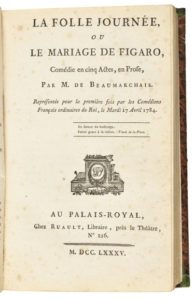 BEAUMARCHAIS (Charles-Augustin Caron de). Ensemble de 6ouvrages reliés en 4volumes. L'Autre Tartuffe, ou la Mère coupable, drame moral. ÀParis, chez Maradan, l'andeuxième [1793-1794]. In-8, taches et mentions manuscrites biffées à l'encre, relié avec l'exemplaire du Mariage de Figaro ci-dessous. ——LeBarbier de Séville, ou la Précaution inutile, comédie. ÀParis, chez Ruault, 1775. In-8, 114pp., bradel de demi-maroquin grenat; premier plat taché (reliure vers 1900). Édition parue l'année de l'originale. Rare, absente des bibliographies d'Henri Cordier et d'Avenir Tchemerzine et Lucien Scheler. ——LeBarbier de Séville, ou la Précaution inutile, comédie. ÀParis, chez Ruault, la veuve Duchesne, 1785. In-8, tache sur le titre, relié avec l'exemplaire du Mariage de Figaro ci-dessous (reliure du xixesiècle). ——LesDeux amis, ou le Négociant de Lyon, drame en cinq actes en prose. ÀParis, chez la veuve Duchesne, Merlin, 1770. In-8, demi-basane filetée (reliure du xixesiècle). Édition originale. Comprend 7pp. de musique notée imprimée. Provenance: le neveu de Catulle Mendès, Gaston de Bar (1866-1948), qui fut, au ministère de l'Éducation nationale, sous-directeur et chef de bureau des travaux historiques et scientifiques et des sociétés savantes (vignette ex-libris). ——Eugénie, drame [...] avec un Essai sur le drame sérieux. ÀParis, chez Merlin, 1767. In-8, bradel cartonné de papier marbré (reliure vers 1900). Édition originale. 5planches gravées sur cuivre hors texte d'après des dessins d'Hubert-François Bourguignon d'Anville dit Gravelot. Une de ces planches est rapportée d'un autre exemplaire et rognée plus court. ——LaFolle journée, ou le Mariage de Figaro, comédie. AuPalais-Royal, chez Ruault, 1785. In-8, demi-veau noir fileté; coiffe supérieure restaurée à la bande adhésive (reliure du xixesiècle). Édition originale.
