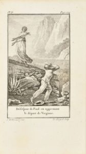 BERNARDIN DE SAINT-PIERRE (Jacques-Henri-Bernardin Saint-Pierre, dit). Paul et Virginie. ÀParis, de l'imprimerie de Monsieur, 1789. In-18, xxxv-(une)-243-(une)pp., basane fauve racinée, dos lisse cloisonné et orné avec pièce de titre rouge, filet brun encadrant les plats, coupes ornées, tranches mouchetées; coiffe supérieure arasée, coins frottés; dernier feuillet un peu plus court (reliure de l'époque). Première édition séparée parue l'année suivant l'originale: Bernardin de Saint-Pierre avait originellement publié l'ouvrage en 1788 dans le quatrième volume de ses Études de la nature. Illustration gravée sur cuivre: 4planches hors texte, soit 3d'après des dessins de Jean-Michel Moreau dit Moreau le Jeune, et une d'après un dessin de Joseph Vernet.
