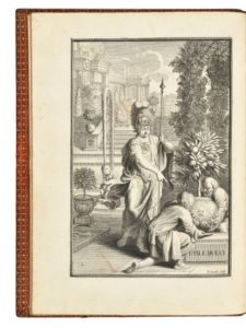 BOILEAU (Nicolas). Œuvres diverses du sieur D*** avec le Traité du sublime ou du merveilleux dans le discours. Traduit du grec de Longin. ÀParis, chez Denys Thierry, 1674. Grand in-4, exemplaire à grandes marges, 24,6x17,8cm; (12)-142-(8)-36[chiffrées 143à178]-(2)-102-(10)pp., maroquin grenat, dos à nerfs, coupes filetées, dentelle intérieure dorée, tranches dorées sur marbrure; les 4ff. de préface au traité de Longin erronément placés après le titre général du recueil; exemplaire lavé, ex-libris du xviiiesiècle et tache à l'encre pâlie sur le titre, 2pâles taches d'encre sur le frontispice (Allô). 2planches gravées sur cuivre hors texte: l'une en frontispice par Pierre Landry, l'autre par François Chauveau. Recueil comprenant notamment Son Art poétique en édition originale: exposé des principes de l'art classique à son apogée et aperçu critique de l'histoire littéraire, cet Art poétique marque l'aboutissement d'une réflexion sur l'art de versifier revivifiée en France depuis le xviesiècle, progressivement articulée à l'étude des questions grammaticales et linguistiques. Pour autant, le texte n'est pas sans présenter certaines contradictions, et Nicolas Boileau n'a pas toujours suivi ses propres préceptes, par exemple dans ses premières satires. Et sa parodie héroï-comique en vers «LeLutrin» en édition originale de. Dans ce récit d'une dispute au sein d'un chapitre sur l'emplacement d'un lutrin, Nicolas Boileau mélange les genres et traite dans un style élevé un sujet vulgaire. Il se sert de ce moyen pour tourner en dérision ce qu'il considère comme les excès de l'emphase littéraire et des abus allégoriques fréquents dans la littérature de son temps , mais peut-être aussi avec des pointes dans un esprit proche du jansénisme, contre les dévots et une certaine décadence de l'église, ou encore avec un éloge ambigu de la gloire du roi. Nicolas Boileau publierait un complément au « Lutrin» en 1683. Le traité Du Sublime, attribué anciennement mais erronément au philosophe et rhétoricien athénien Longin (IIIesiècle après J.-C.), figure ici dans la traduction française établie par Gilles Boileau, frère de Nicolas Boileau qui a cependant probablement apporté des retouches au texte.