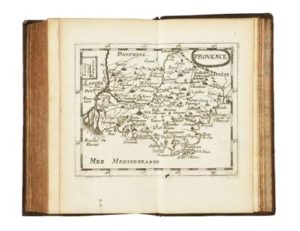 DUVAL (Pierre). La Geographie françoise, contenant les descriptions, les cartes et le blason des provinces de France. AParis, chez l'auteur, s.d. In-12, 260-(2)pp., veau brun granité; accroc à la coiffe supérieure, un départ de mors entamé (reliure de l'époque). Charmant atlas en format de poche originellement paru en 1659, renfermant «des renseignements essentiels pour le lecteur du xviiesiècle» selon Mireille Pastoureau, qui n'a pas recensé cette édition dans sa bibliographie (DuvalX). 72planches gravées sur cuivre dont 36à double page montées sur onglets, soit: un titre général à double page, un titre particulier, une table des cartes à double page, 34cartes à double page, 35représentations héraldiques. Relié avec le titre d'un autre atlas de Pierre Duval, LaFrance sous le roy LouisXIV. ÀParis, chez l'auteur, 1667.