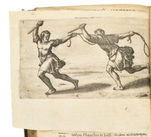 LIPSE (Joost Lips, dit Juste). Recueil de 2ouvrages reliés en un volume in-4, vélin semi rigide à recouvrement, dos lisse avec titre à l'encre, tranches mouchetées de bleu, vestiges de liens de parchemin (reliure moderne avec gardes anciennes conservées). Saturnalium sermonum libri duo, qui de gladiatoribus. Antverpiæ, apud Christophorum Plantinum, 1588. In-4, (8)-175-(uneblanche)pp.; feuillets du cahier P reliés en désordre, mention manuscrite grattée au titre, quelques restaurations marginales. Seconde édition de cet ouvrage consacré aux gladiateurs de la Rome antique. Première édition illustrée comprenant 16planches dépliantes hors texte gravées sur cuivre, soit, 4de grand format non numérotées, et 12de moyen format lettrées AàM. Avec une marque typographique de Christophe Plantin gravée sur bois au titre. —DeAmphitheatro liber. Ibid., 1585. In-4, 105-(3dont la dernière blanche)pp. Illustration gravée sur cuivre: 2planches dépliantes hors texte montées sur onglets (vues du Colisée) et une composition dans le texte. Avec une marque typographique de Christophe Plantin gravée sur bois au titre. Imprimé à la suite, du même auteur, avec feuillet de titre particulier: De Amphitheatris quæ extra Romam. Illustration gravée sur cuivre: 2planches doubles montées sur onglets et 3compositions dans le texte, dont des vues des arènes de Nîmes, de Vérone, et de Doué-en-Anjou. Avec une marque typographique de Christophe Plantin gravée sur bois au titre. Édition conjointe des deux traités, parue l'année suivant l'originale également conjointe.