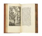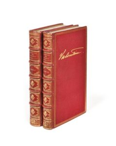 PRÉVOST (Antoine-François). Histoire du chevalier DesGrieux, et de Manon Lescaut. ÀAmsterdam, aux dépens de la Compagnie, 1753. 2volumes in-12 (composition au format petit in-12 réimposée au format grand in-12), (4dont les 2aux versos blanches)-302-(2dont la seconde blanche) +(4dont les 2aux versos blanches)-252pp., maroquin rouge, dos à nerfs cloisonnés et fleuronnés, triple filet doré encadrant les plats avec la mention «Valentine» doré sur les premiers plats, coupes filetées, dentelle intérieure dorée, tranches dorées sur marbrure; faux-titre et verso du titre du premier volume un peu tachés (Trautz-Bauzonnet). Volumes placés dans un boîtier de maroquin rouge doublé de velours, à l'imitation de livres; dos passés. Édition en partie originale. L'abbé révost y a porté des modifications et des additions, notamment un épisode entier, celui du prince italien. Exemplaire avec 2cartons: ff.N3 du vol.I, B1, I1 et L3 du vol.II. Belle illustration gravée sur cuivre: 8planches hors texte, soit 6planches par Jacques-Jean Pasquier et 2planches par Jacques-Philippe LeBas d'après Hubert-François Bourguignon d'Anville dit Gravelot; avec 2bandeaux gravés sur cuivre dans le texte par Jacques-Jean Pasquier (une même composition répétée). Il s'agit ici du second tirage des planches, après modifications de contrastes qui «ont nettement amélioré la qualité des gravures» (Max Brun, n°XXXV). Rare. Superbe exemplaire. Provenance: Valentine Delessert (ex-libris doré sur les premiers plats et vignettes ex-libris sur les premiers contreplats, exemplaire cité par Max Brun p.355 de sa bibliographie). Petite-fille du financier Jean-Joseph de Laborde et fille de l'homme politique et historien Alexandre de Laborde, Valentine de Laborde (1806-1894) épousa l'homme politique Gabriel Delessert. Elle tint un important salon sous la Monarchie de Juillet, et, un temps la maîtresse de Prosper Mérimée qui la présenta aux Montijo, elle devint une intime de l'impératrice Eugénie.