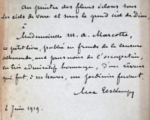 Édition originale et unique de ce charmant ouvrage folklorique sur le jeu populaire du loto (histoire, description des cases, variantes de jeu...) illustré par l'auteur de différents bois de couleurs : cadres à petits coeurs entrelacés vert-de-gris,- 5 grands ornements noirs en tête des chapitres,- vignettes, culs-de-lampe, lettrines en orange. Tirage à 350 ex., un des 300 sur Satin surfaced smooth antique (n° 242). L'ouvrage a été antidaté pour tromper les Allemands et a paru en réalité en 1918. Envoi autographe de l'auteur, signé du 2 juin 1919 : "Au peintre des fleurs écloses sous les ciels de verre et sous le grand ciel de Dieu, à Mademoiselle m.a. Marcotte, ce petit livre, publié en fraude de la censure allemande, aux jours noirs de l'occupation, en très admiratif hommage, d'un rêveur qui fut, à ses heures, un jardinier fervent". # Sadeleer, n° 32 et n° 33 (mais ne répertorie pas cet exemplaire); # Culot, Bibl. des écrivains de Belgique, p. 70.
