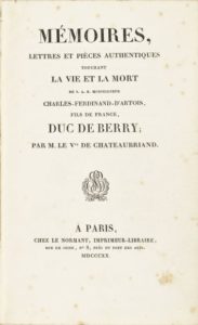 BERRY (duc de). —Recueil de 4plaquettes in-8 concernant l'assassinat du duc de Berry en 1820, reliées en un volume de basane brun-vert, dos lisse richement orné, fine frise dorée encadrant les plats avec médaillon doré au centre, coupes ornées, tranches dorées; dos passé avec accroc à un nerf, coins émoussés, manque de cuir à un départ de mors (reliure de l'époque). Chateaubriand (François-René de). Mémoires, lettres et pièces authentiques touchant la vie et la mort de S.A.R. Monseigneur Charles-Ferdinand d'Artois, fils de France, duc de Berry. ÀParis, chez LeNormant, 1820. In-8. Édition originale. —Hapdé (Jean-Baptiste-Augustin). Relation historique, heure par heure, des événemens funèbres de la nuit du 13février 1820, d'après des témoins oculaires. ÀParis, chez Dentu (imprimerie de LeNormant), 1820. Édition en partie originale. —Relation exacte de la mort de SonAltesse Royale Mgr le duc de Berry, rédigée d'après les renseignemens fournis par les personnes les plus dignes de foi, qui n'ont pas quitté le prince depuis le moment de son assassinat jusqu'à celui de sa mort. Paris, LeNormant, 1820. —Roullet (Nicolas-Pierre). Notice historique des événements qui se sont passés dans l'administration de l'Opéra, la nuit du 13février 1820. ÀParis, de l'imprimerie de P.Didot, l'aîné, [1820]. Édition originale. Relié avec 2autres plaquettes: [Beauchamp (Alphonse de)]. LaDuchesse d'Angoulême à Bordeaux, ou Relation circonstanciée des événemens politiques dont cette ville a été le théâtre en mars 1815. ÀVersailles, de l'imprimerie de J.-A.Lebel, 1815. Édition originale. —Chazet (René Alissan de). La Nuit et la journée du 29septembre 1820, ou Détails authentiques de tout ce qui s'est passé le jour de la naissance de Monseigneur le duc de Bordeaux [fils posthume du duc de Berry]. ÀParis, chez Ponthieu, 1820. Édition originale. Provenance: bibliothèque de l'institution Hallays-Dabot, pensionnat scolaire parisien tenu par Pierre-Victor Hallays (1782-1867).