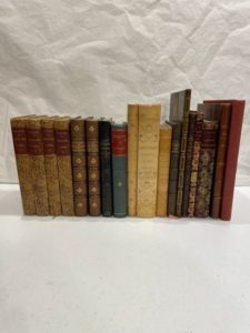 CLAUDEL (Paul). Ensemble de 18volumes reliés. L'Annonce faite à Marie. Paris, Éditions de la Nouvelle revue française, 1913. In-16, bradel cartonné avec armoiries de la famille Mancini dorées au dos. Édition parue l'année suivant l'originale. Envoi autographe signé daté de Rio en 1919, avec dessin original, à Marie-Rose Mancini, fille du général Yémin Nazare Aga (ministre de Perse à Paris pendant 35ans) et veuve d'un diplomate français. —L'Arbre. Paris, Société du Mercure de France, 1901. In-18, bradel de percaline (reliure de l'époque). Première édition collective, en partie originale. Exemplaire avec quelques notes anciennes, en marge au crayon et à l'encre sur les dernières gardes. —L'Histoire de Tobie et de Sara. Moralité en trois actes. [Paris], Gallimard (Nrf), 1942. In-16, demi-maroquin à coins, tête dorée; dos passé (Alix). Édition originale, un des 135exemplaires numérotés sur vélin pur fil Navarre. Première version du texte. —Introduction à quelques livres. Paris, A.Monnier etCie (collection Les Cahiers des Amis des livres), 1920. In-4, demi-maroquin à coins; cuir passé (Franz). Édition originale, un des 50exemplaires de tête sur vergé pur fil Lafuma. Conférence prononcée le 30mai 1919. —Le Livre de Christophe Colomb. Paris, Gallimard (Nrf), 1935. In-16, demi-chagrin à coins, tête dorée; dos passé. Un des 130exemplaires sur alfa Navarre. Ouvrage originellement paru en 1933. —LaNuit de Noël de 1914. Paris, à L'Art catholique, 1915. In-8 carré, bradel cartonné avec armoiries de la famille Mancini dorées au dos; quelques taches angulaires. Édition originale dont il ne fut tiré que 39exemplaires de tête sur grand papier. Envoi autographe signé daté de 1919, à Marie-Rose Mancini. —Poèmes paroles durant la guerre de Trente Ans. [Paris], Gallimard (Nrf), 1945. In-16, bradel cartonné. Première édition de ce recueil, exemplaire numéroté dans un cartonnage illustré d'après une maquette de Paul Bonet. —Positions et propositions. Art et littérature. Paris, Librairie Gallimard (éditions de la Nouvelle revue française), 1928. In-16, demi-chagrin, tête dorée (LeDouarin rel.). Édition originale, un des 271exemplaires numérotés sur vélin pur fil Lafuma-Navarre, seuls tirés sur grand papier. Provenance: «A.S.H.» (ex-libris doré en queue de dos). —Tête d'or. Paris, librairie de L'Art indépendant, 1890. In-8, demi-chagrin brun, tête dorée; sans les couvertures dont la première sert de titre (reliure ancienne). Édition originale, à tirage restreint, du premier livre de Paul Claudel. —Etc. Claudel (Paul) et André Gide. Correspondance. 1899-1926. [Paris], Gallimard (Nrf), 1949. In-8, bradel cartonné. Édition originale, exemplaire numéroté sur vélin labeur dans un cartonnage illustré d'après une maquette de Paul Bonet. —Claudel (Paul) et André Suarès. Correspondance. 1904-1938. [Paris], Gallimard (Nrf), 1951. In-8, bradel cartonné. Édition originale, exemplaire numéroté sur vélin labeur dans un cartonnage illustré d'après une maquette de Paul Bonet.