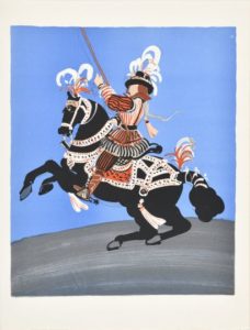 DERAIN (André). —Amis Amille. Mystère du XIVesiècle. [Paris], Nouveau cercle parisien du livre, 1957. Grand in-4, (6blanches)-95-(7dont la 3eet les 3dernières blanches)pp., en feuilles sous portefeuille, chemise et étui cartonné de l'éditeur; quelques rousseurs sur le portefeuille. 150 / 200 € Édition originale de la version en français moderne par Élémir Bourges, tirée à 180exemplaires numérotéws sur vélin B.F.K. de Rives, celui-ci nominatif de MaxBrun. Illustration lithographiée en couleurs par André Derain: 22compositions dans le texte, dont une àdouble page et 2à pleine page.