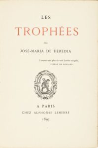 HEREDIA (José-Maria de). Ensemble de 2volumes. LaNonne Alferez. Paris, Alphonse Lemerre, 1894. Petit in-12, bradel de demi-maroquin marron, dos frotté avec petit accroc à la coiffe supérieure. Édition originale, un des 50exemplaires numérotés sur japon, justifiés par l'éditeur. —Les Trophées. A Paris, chez Alphonse Lemerre, 1893. In-8, broché, sous chemise à dos de maroquin dans un étui bordé; traces de colle sur la couverture, quelques cahiers déchaussés, dos de chemise passé. Première édition en librairie, avec titre imprimé en rouge et noir, achevée d'imprimer le même jour que l'originale (10exemplaires seulement) et parue un mois après celle-ci. Exemplaire de première émission, sans carton à la page 196, c'est-à-dire sans les 2 vers ajoutés à la fin de la strophe du haut («Sur un brave étalon cap de more qui fume/ Etpiaffe, en secouant son frein blanchi d'écume.»), et avec le premier vers de la strophe du bas avant modification («Sous cette brave escorte, au trot de leurs deux mules» au lieu de «Ainsi bien escortés, à l'amble de leurs mules»).