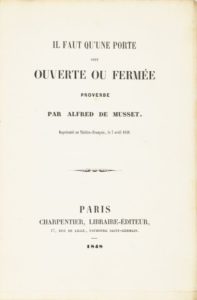 MUSSET (Alfred de). Ensemble de 4volumes; soit un volume relié, et 3brochés dont 2sous chemise à dos de maroquin rouge (passé) dans un étuibordé. Bettine. Comédie en un acte et en prose. Paris, Charpentier, 1851 In-12, broché; le volume se déchausse. Édition originale. —IlFaut qu'une porte soit ouverte ou fermée. proverbe. Paris, Charpentier, 1848. In-12, broché; volume déchaussé avec couverture un peu usagée avec prix gratté et inscription ex-libris manuscrit ancien. Édition originale. —Nouvelles. Paris, Charpentier, 1841. In-12, demi-chagrin orné, couvertures conservées; quelques rousseurs (reliure moderne). Première édition de ce recueil. —UnCaprice. Comédie en un acte. Paris, Charpentier, 1848. In-12, broché; le volume se déchausse. Pièce originellement parue en 1840 dans le recueil Comédies et proverbes.