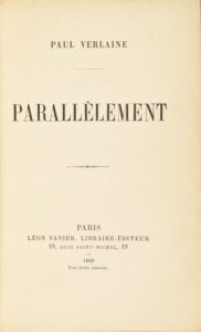 VERLAINE (Paul). Ensemble de 4volumes. Éditions originales. Amour. Paris, Léon Vanier, 1888. In-18, bradel de demi-maroquin à coins, couvertures conservées (reliure moderne). —Dans les limbes. Paris, Léon Vanier, 1894. In-12, broché. Édition originale. Portrait-frontispice par Ladislas Loevy. Provenance: Maurice Houber (estampille ex-libris sur la couverture). —Odes en son honneur. Paris, Léon Vanier, 1893. In-12, broché. —Parallèlement. Paris, Léon Vanier, 1889. In-18, demi-chagrin à coins, tête dorée, couvertures conservées (reliure moderne). Édition dont il ne fut tiré aucun exemplaire de tête sur grand papier. Sans le tiré à part du poème «Chasteté», spécimen du recueil Bonheur à paraître, joint dans quelques rares exemplaires de Parallèlement.