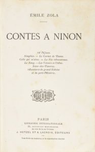 ZOLA (Émile). Ensemble de 6volumes. Joint, un volume concernant Émile Zola. L'Assommoir. Paris, Georges Crès etCie, 1920. 2tomes en un fort volume in-12, demi-maroquin orné à coins, tête dorée (Flammarion Vaillant). Romans du cycle des Rougon-Macquart, originellement paru en 1877. Du tirage numéroté sur vélin de Rives. Frontispices gravés sur bois par René-George Hermann dit Hermann-Paul. Superbe exemplaire. —LaConfession de Claude. Paris, C.Marpon et E.Flammarion, 1880. In-18, bradel de demi-toile à coins, couvertures conservées (reliure moderne). Roman originellement paru en 1866. —Contes à Ninon. Paris, Librairie internationale, J.Hetzel et A.Lacroix, [1864]. In-18, demi-basane filetée (reliure de l'époque). Édition originale, dont il ne fut pas tiré d'exemplaires de tête sur grand papier. Premier livre d'Émile Zola, recueil de contes et nouvelles. —Fécondité. Paris, Eugène Fasquelle («Bibliothèque-Charpentier»), 1899. In-12, demi-maroquin orné, tête dorée, couvertures conservées (reliure de l'époque). Édition originale. —LaTerre. Paris, G.Charpentier etCie, 1887. In-12, veau; tête dorée, couvertures conservées; dos passé (reliure moderne). Édition originale de ce roman du cycle des Rougon-Macquart. Un tiré à part du GilBlas avait cependant paru peu avant. —Théâtre. Paris, G.Charpentier, 1878. In-12, demi-veau orné; reliure un peu frottée avec dos passé (reliure de l'époque). Édition en partie originale, un des 75exemplaires numérotés sur vergé de Hollande, seuls sur grand papier après 2sur chine. Comprend Thérèse Raquin (originellement parue en 1868), LesHéritiers Rabourdin (originellement parue en ), LeBouton de rose (en édition originale). — Joint: Émile Zola. Paris, Cahiers de la quinzaine, série n°4, cahier n°5, 4décembre 1902. In-18, broché. Numéro d'hommage à l'écrivain mort en septembre 1902, comprenant notamment le discours prononcé par Anatole France aux funérailles de celui-ci.