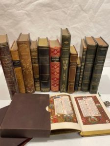 HISTOIRE et divers. XIXe-XXesiècles. —Ensemble d'environ 20volumes; quelques défauts et incomplétudes. Courier (Paul-Louis). Collection complète des pamphlets politiques et opuscules littéraires. Bruxelles, chez tous les libraires, 1826. In-8, demi-veau; reliure usagée (reliure de l'époque). Première édition collective. Portrait-frontispice gravé sur cuivre. —Defoe (Daniel). Aventures de Robinson Crusoe. Paris, H.Fournier, 1840. In-4, demi-chagrin à coins orné; dos passé et taché (reliure de l'époque). Illustration gravée sur bois par Jean-Ignace-Isidore Gérard dit Grandville. —Florian (Jean-Pierre Claris de). Fables. Paris, Delloye, Desmé etCie, 1838. In-4, demi-basane filetée; reliure usagée et tachée (reliure de l'époque). Avec notice par Charles Nodier. Illustration d'après des dessins de Victor Adam, hors-texte à l'eau-forte tirés sur chine appliqué, bois gravés dans le texte. —Heures du Moyen-âge. Paris, Gruel, Engelmann, 1862. In-16, maroquin orné, fermoirs métalliques, tranches dorées, volume placé sous chemise et étui de percaline (reliure de l'éditeur). Ouvrage entièrement chromolithographié. —[LouisXVIII]. Relation d'un voyage à Bruxelles et à Coblentz. (1791). Paris, Baudouin frères, 1823. In-8, demi-veau fleurdelisé; longue fente au mors supérieur (reliure de l'époque). Provenance: Léon Brun (estampille sur le titre). —Maeterlinck (Maurice). LaVie des termites. Paris, Bibliothèque-Charpentier, Eugène Fasquelle, 1926. In-16, maroquin orné, tête dorée. Édition originale. Frontispice. —Satyre ménippée de la vertu du catholicon d'Espagne et de la tenue des estats de Paris. ÀParis, chez N.Delangle, et chez Dalibon, 1824. 2volumes in-8, demi-veau glacé frotté (reliure un peu postérieure). Avec préface de Charles Nodier. Eaux-fortes hors texte par Tony et Alfred Johannot d'après Achille Devéria, tirées sur chine appliqué. —Thomas a Kempis (Thomas Hemerken, dit). L'Imitation de Jésus-Christ. Tournai, Desclée, Lefebvre etCie, 1881. In-16, maroquin orné, tranches dorées (reliure de l'éditeur). —Verronnais (François). Annuaire historique, statistique, administratif, militaire, judiciaire et commrecial du département de la Moselle pour 1850-1851. Metz, Verronnais; Paris, Courcier, 1850. In-12, demi-chagrin orné (reliure de l'époque). —Etc.