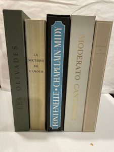 ILLUSTRÉS MODERNES. —Ensemble de 9volumes, tous en feuilles sous portefeuille, chacun placé sous chemise et étui cartonnés ou boîtier des éditeurs; quelques défauts et incomplétudes. Dante (Dante Alighieri, dit). L'Enfer. [Lyon], Cercle lyonnais du livre, 1955. Grand in-4. Édition tirée à 182exemplaires, celui-ci un des 130numérotés sur grand vélin de Rives, nominatif de Max Brun. Bois gravés monochromes et en couleurs d'après des dessins d'Auguste Rodin par Paul Baudier. —Duras (Marguerite). Moderato cantabile. [Paris], LeLivre contemporain LesBibliophiles franco-suisses, 1964. Grand in-4. Édition tirée à 200exemplaires sur vélin de Rives, celui-ci nominatif de Max Brun. Lithographies en couleurs par André Minaux. —Fontenelle (Bernard de). Entretiens sur la pluralité des mondes. [Paris], Lescentraux bibliophiles, [1960]. Grand in-4. Édition tirée à 175exemplaires numérotés sur vélin d'Arches, celui-ci nominatif de Max Brun. Illustration en couleurs par Roger Chapelain-Midy, gravée sur bois dans l'atelier de Théo Schmied. —Mistral (Frédéric). LesOlivades. [Paris], LeLivre contemporain Les Bibliophiles franco-suisses, 1963. Grand in-4. Édition tirée à 200exemplaires numérotés sur vélin de Rives. Lithographies en couleurs par Roland Oudot. —Nouveau (Germain). LaDoctrine de l'amour suivie de Dernier madrigal. [Paris], LeLivre contemporain Les Bibliophiles franco-suisses, 1966. In-folio. Édition tirée à 189exemplaires numérotés sur vélin de Rives, celui-ci nominatif de Max Brun. Eaux-fortes en couleurs par Henri Landier. —Proust (Marcel). Journées de lecture. [Paris], LeLivre contemporain Les Bibliophiles franco-suisses, 1969. Édition tirée à 180exemplaires numérotés sur grand vélin de Rives à la forme, celui-ci nominatif de Max Brun. Eaux-fortes par Pierre Lesieur. —Rimbaud (Arthur). Poèmes en prose. [Paris], Lescentraux bibliophiles, 1964. Grand in-4. Édition tirée à 140exemplaires numérotés. Lithographies par André Beaurepaire. —Verlaine (Paul). Jadis naguère. [Paris], LeLivre contemporain Les Bibliophiles franco-suisses, 1971. In-folio. Édition tirée à 175exemplaires numérotés sur vélin d'Arches, celui-ci nominatif de Max Brun. Lithographies en couleurs par Gabriel Dauchot. —Verlaine (Paul). Parallèlement. Paris, Georges Guillot, 1949. In-folio. Un des 130exemplaires numérotés sur Rives blanc à la forme avec illustrations en noir et 5planches non retenues. Pointes sèches par Mariette Lydis. Exemplaire d'une suite en noir.