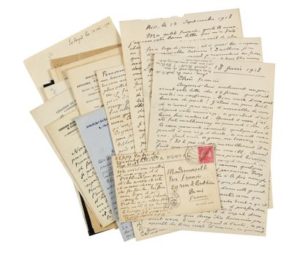 CLAUDEL (Paul). Correspondance d'environ 50 lettres et cartes, ainsi que 3 télégrammes, adressée à la comédienne Ève Francis. 1917-1951. Magnifique correspondance amoureuse puis amicale, évoquant notamment leur collaboration au théâtre. UNE DES GRANDES INTERPRETES CLAUDELIENNES, ÈVE FRANCIS (1886-1980), née Éva-Louise François à Bruxelles, fut découverte en 1913 au Théâtre Antoine par Lugné-Poe qui la présenta à paul Claudel. Elle fut choisie pour créer en 1914 le personnage de Sygne de Coûfontaine dans L'Otage. Claudel tomba amoureux d'Ève Francis, mais elle épousa en janvier 1918 l'écrivain et cinéaste Louis Delluc (1890-1924), dont elle se sépara bientôt, mais avec qui elle devint une vedette du cinéma en tournant dans La Fête espagnole, La Femme de nulle part, L'Inondation. Célèbre — Van Dongen fit son portrait en 1919 — elle n'abandonna pas pour autant le théâtre, et demeura une des interprètes préférées de Paul Claudel : elle créa notamment le rôle de Doña Prouhèze dans Le Soulier de satin, lors de sa diffusion radio en 1942. Par ailleurs critique, pédagogue et directrice de théâtre, elle publia ses souvenirs sur Paul Claudel en 1973, Un Autre Claudel. « En face de S. Vincent (îles du Cap-Vert) », 22 janvier 1917 : « Me voici au milieu de mon voyage et de l'Atlantique en vue d'îles aussi stériles et aussi dures que du fer fondu. En face une ligne de pics pareils à des échardes. C'est là q[ue] n[ous] allons faire une escale de q[uel]q[ues] heures, le temps de v[ous] envoyer mon fidèle souvenir : 13e jour depuis q[ue] j[e] v[ous] ai quittée... » — [Brésil], 18 juin 1918 : « ... J'étais un peu triste de n'avoir pas reçu de nouvelles de vous depuis votre mariage, ce qui était d'ailleurs tout naturel. Quant à moi, j'ai été fort malheureux en pensant à vous. Si le cœur pouvait connaître quelque chose de pareil à une rage de dents, ce serait mon cas.. Quand j'étais jeune et dans ma période héroïque, les femmes m'étaient complètement indifférentes. Ensuite j'ai connu quelques années de passion et de possession trop violentes pour ne pas être à la fois aveugles et douloureuses. Ce n'est que plus tard et jusque maintenant, dans cette grande solitude où je suis ici sans autre issue que la prière, que je comprends tout ce qu'il peut entrer d délicatesse, de profondeur, de vivacité, de sacrifice, de suavité et de respect dans les relations que deux êtres humains peuvent avoir l'un à l'égard de l'autre, ce qu'on appelle du beau mot d'amour, ce qui seul vaut la peine de vivre, et ce qui est si beau qu'il mérite d'être le reflet d'une autre amour qui, celui-là, ne sera pas déçu. Il est cruel de penser que les deux seules femmes que j'ai vraiment aimées, et qui, je le crois, m'ont aimé aussi, ont été séparées de moi par le destin et sont en la possession d'autres... Peut-être qu'au fond le bonheur est indigne d'un homme et empêche le travail... Je ne sais si j'aurai le courage de vous revoir quand je reviendrai à Paris, cela me fera trop de peine, et à quoi bon s'exposer à de nouvelles tortures ? [Il évoque ensuite ses ennuis professionnels et sa tristesse à la pensée que la France est ravagée par la guerre.] Je vois que vous n'avez pas élargi le répertoire des poèmes de moi que vous récitez. Pourquoi n'en apprenez-vous pas d'autres ? Par exemple "Le Cantique de la vigne" que vous diriez merveilleusement, j'en suis tout à fait sûr ?... » —— Paul Claudel évoque ses démarches infructueuses pour faire jouer ses pièces en 1919-1920, notamment auprès de Jacques Copeau. —— Paris, 31 août 1921 : « Je délègue à Madame Ève Francis le contrôle artistique sur la représentation de mes œuvres... en province et à Paris. Il est bien entendu qu'aucune représentation de ces œuvres en France ne pourra avoir lieu sans son consentement... » —— Tokyo, 15 décembre 1921 : « ... J'ai quitté Paris dans un de ces accès de sauvagerie qui me prennent quelquefois, avec le désir passionné de disparaître et de tout oublier. Comme je vous plains d'être obligé de vivre dans ce Paris dont l'atmosphère me suffoque comme celle d'un entresol empesté ! J'ai abandonné avec délices toutes mes idées de théâtre, d'Académie, de vie mondaine etc. et je n'ai plus qu'una ambition qui est de travailler seul et à ma guise et de ne plus rien publier avant longtemps... » —— Tokyo, 6 janvier 1922 : « ... Vous auriez l'intention de jouer le P[ère] h[umilié] à L'Œuvre. cela me contrarie beaucoup car L'Œuvre sous sa forme et sans préparation est difficile à défendre. J'avais l'intention d'en écrire pour vous, dès que Le Soulier de satin sera fini, une nouvelle version qui vous aurait plu davantage... » —— Etc. JOINT : CLAUDEL (Paul). 3 lettres autographes signées à son ami l'écrivain Louis Piérard. Brangues en Isère, 1940-1942. Concernant en partie Ève Francis. —— CLAUDEL (