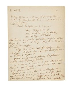 BAUDELAIRE (Charles). Lettre autographe signée «Charles» à sa mère Caroline Dufaÿs, madame Aupick. [Paris], 31octobre 1858. Unep. in-4, adresse au dos (Honfleur). «Tu peux continuer à m'écrire. Àpartir de demain matin, la chambre est louée, non plus au mois, mais à la journée. Voilà les caisses que tu recevras: deux caisses de livres, une de cartons et de boîtes, une de linge et d'habits. Cette dernière ne partira naturellement qu'en même temps que moi. Àchaque fois, tu me diras: j'ai reçu une caisse. Laisse donc là ton idée fantastique de soupape. Crains-tu donc que je saute, comme un bateau à vapeur? [Sa mère se proposait de faire des aménagements dans la chambre où devait loger son fils chez elle à Honfleur, en raison du fait que celui-ci fumait.] Quant au genre de planches, les planches mobiles sont toujours préférables. Je te remercie de nouveau de toute cette activité charmante que tu mets à mon service. Quant à ma main, dont la maladresse va augmentant de jour en jour, non, ce n'est pas rhumatismal; car je ne souffre pas. –Je t'embrasse de tout mon cœur...» Provenance: Jean de LaCarrière (estampille de collection sur un verso blanc).