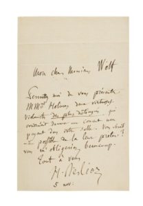 BERLIOZ (Hector). Lettre autographe signée à Auguste Wolff. [Paris], «5novembre». Une p. in-8, adresse au dos. «Permettez-moi de vous présenter MMrsHolmes, deux virtuoses violonistes des plus distingués qui voudraient donner un concert non payant dans votre salle. Vous serait-il possible de la leur prêter? Vous m'obligeriez beaucoup. Tout à vous...» Les frères Alfred et Henry Holmes, violonistes et compositeurs anglais, admirés de Louis Spohr, séjournèrent un temps en France. Hector Berlioz leur apporta leur soutien et encouragea Alfred Holmes à se consacrer aussi à la composition. Associé de la Maison Pleyel à partir de 1853 puis directeur à partir de 1855, l'entrepreneur Auguste Wolff fut également pianiste et compositeur.