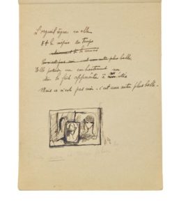 LAURENCIN (Marie). Carnet de notes autographes, 11ff. dans un carnet in-8. Avec mention autographe signée, postérieure, à l'encre: «Ce carnet vient d'Espagne. Madrid, Malaga, Barcelone, Madrid... 1914-1919». «Animaux, chien-chat» (2pp. in-8, au crayon), «Rois et reines» (unep. in-8, au crayon et à l'encre), «L'orgueil règne en son cœur...» (2pp. in8, principalement à l'encre, avec dessin original), «Cheval et moi...» (unep. in-8, au crayon), «Jevoudrais rêver...» (1/2p. in-8, au crayon), «Lechien de chasse» (2/3p. in-8, au crayon, avec mention autographe marginale postérieure au crayon, «le chien c'est Coco en Espagne»), «Rêves» (1/2p. in-8, au crayon), «Amour/Mon seul amour/C'est l'amour de la vie...» (1/3p. in-8, à l'encre), «Chien ton humeur/ est plus mauvaise que la mienne...» (1/3p. in-8), «Humeur. Rêve./ Je voudrais mourir comme un chien/ Sans scandale/ et sans honte,/ par faiblesse» (4vers, à l'encre), «Tigre espagnol/ est un peintre/ au visage cruel/ Et si j'étais un ange ardent,Avec mon cheval/ et ma lance,/ Je le mettrais en pièces/ Don Juan» (8vers, à l'encre), «Animaux/ sans patine/ Vous êtes mes seuls amis» (3vers, à l'encre), «Femme quelconque...» (1/2p. in-8, au crayon), «Àla mer...» (1/4p. in-8), «Àma...(3/4p. in-8, à l'encre). Le feuillet portant le poème «Chien de chasse» porte deux mentions autographes de Marie Laurencin ajoutées à l'époque: «L'Angleterre reine des mers en paix, Gabrielle Buffet reine des cœurs en guerre» (Gabrielle Buffet était alors l'épouse de Francis Picabia) et «Picasso, la cruauté extraordinaire de son visage, d'ailleurs aucune humanité dans son esprit». Le dessin original représente des portraits féminins, apparemment des autoportraits dans des miroirs (encre et plume, environ 4x6cm). Ayant épousé en juin 1914 le peintre allemand Otto von Wätjen, Marie Laurencin dut s'expatrier durant tout le temps de la guerre et vécut en Espagne, à Madrid et Barcelone où elle collabora par des textes et une illustration à la revue 391 de Francis Picabia. Après un passage en Allemagne par l'Italie et la Suisse, elle revint en France en 1921 et divorça de son mari cette année-là. Joint, un portrait photographique de Marie Laurencin (28,7x20,7cm), avec légende manuscrite au verso, «Marie Laurencin rue Vaneau, 1952».