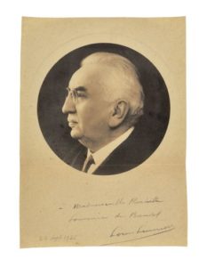 LUMIÈRE (Louis). Portrait photographique. Tirage par héliographie en médaillon 11,9cm sur un f.in-8 de papier fin. Envoi autographe signé: «ÀMademoiselle Rochette, souvenir de Bandol... 22sept. 1935»
