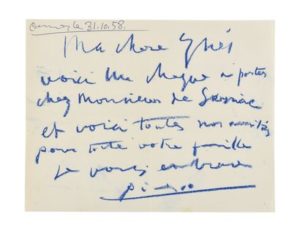 PICASSO (Pablo). Lettre autographe signée « Picasso » à sa femme de chambre Inès Sassier. Cannes, 31octobre 1958. Unep. in-foliooblong au crayon gras bleu; enveloppe conservée à l'adresse de son hôtel particulier de la rue des Grands-Augustins. «Ma chère Ynès, voici un chèque à porter chez monsieur de Sarriac et voici toutes nos amitié pour toute votre famille. Je vous embrasse...» L'avocat Bernard de Sarriac était chargé de contrôler la pension alimentaire que Pablo Picasso devait verser à Claude et Paloma Picasso, enfants qu'il avait eus avec Françoise Gilot.
