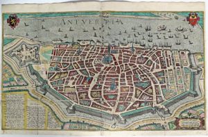 Premier tirage de cet important et beau plan panoramique de la ville et de l'Escaut, accompagné de vers en latin sur la magnificence d'Anvers. Cette planche figure dans les atlas de Braun & Hogenberg ("Theatrum urbium et civitatum orbis terrarum", 15721616) et de Jansson ("Urbium totius Belgii", 1657). On en trouve des copies réduites dans la "Pompa introïtus" de Gevartius (1641) et dans le "Stedenboeck" de Blaeu (c. 1649). # Delen 74; # van der Krogt 184 (4e état avec le nom de Hoefnagel).