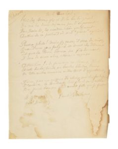 VERLAINE (Paul). Poème autographe signé «Paul Verlaine», intitulé «Àl'aimée». Hôpital Broussais à Paris, 18septembre 1893. 14vers occupant 3/4p. in-8, mention marginale autographe «Dédicaces»; une marge un peu effrangée, large mouillure en marge basse affectant la date, la signature et trois mots du poème. Sonnet publié en février 1894 dans la Revue blanche sous le titre «Contre la jalousie», puis, sous le présent titre «Àl'aimée», intégré dans la seconde édition de son recueil Dédicaces parue en 1894. «Voici des cheveux gris et de la barbe grise. Tu me les demandas en un jour d'enjouement Pour, disais-tu, les encadrer bien gentiment Autour de ce portrait où ma "grâce" agonise. Pauvre photo! Mais j'y pense, il sera de mise, Quand mes yeux fatigués se seront clos dûment Et que la terre bercera son fils dormant, Il sera de saison alors, chérie –exquise...»