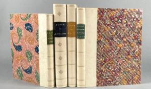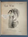 ALBUMS HUMORISTIQUES FIN DE SIÈCLE. Réunion de 29 ouvrages de Bac, Forain, Gerbault, Guillaume, Léandre, Caran d'Ache, Courboin, Geoffroy, Willette, Fau, Crafty, reliés en 4 volumes in-folio demi-vélin blanc, dos lisses, couvertures conservées. Compositions en noir et en couleurs, ces dernières parfois coloriées au pochoir. 1. Bac. Les Fêtes galantes. Préface d'Arsène Houssaye. 1894. - Nos femmes. Préface de Maurice Donnay. S. d. - Les alcôves. Préface de R. O'Monroy. S. d. - Nos amoureuses. Préface de Xanrof. S. d. - Femmes de théâtre. Prologue d'Yvette Guilbert. 1896. S. d. - La femme intime. Préface de Marcel Prévost. 1894. - Modèles d'artistes. Préface par un ancien modèle. S. d. 2. J. L. Forain. La vie. S. d. - Nous Vous Eux. S. d. - Léandre. Paris et la vie de province. S. d. - H. Gerbault. Parisiennettes. 1894. 3. Guillaume. Étoiles de mer. Préface par Abel Hermant. S. d. - Madame est servie. Préface de Grosclaude. S. d. - Y a des dames. Préface de Willy. S. d. - Faut voir. Préface de Aug. Germain. S. d. - Mémoires d'une glace… Préface par Paul Hervieu. S. d. - P'tites femmes. Préface de F. Vanderem. S. d. - Des bonshommes. Préface de Fr. Chevassu. - Des bonshommes. II. Préface par H. Lavedan. S. d. - Mes campagnes. Préface de G. Courteline. 4. Caran d'Ache. C'est à prendre ou à laisser. S. d. - Bric-à-brac. S. d. - Caran d'Ache, Courboin, Gerbault…, Guillaume. S. d. - Forain. Caran d'Ache… Willette… Rires et grimaces. S. d. - Crafty. Quadrupèdes et bipèdes. S. d. - Croquis parisiens. S. d. - Les Chiens. S. d. - Les Chevaux. S. d. Rare collection bien reliée et parfaitement conservée avec toutes les couvertures en couleurs.