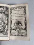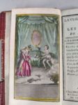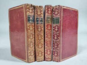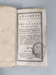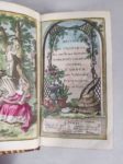 ALMANACHS. — Réunion de 4 volumes in-16, maroquin rouge, filets dorés, dos lisses ornés, pièces noires, tranches dorées, gaines latérales pour porte-mine. LE FOND DU SAC ou ce qui reste des traductions d'un bel esprit… Paris, Desnos, vers 1780. - Deux titres gravés et 5 figures hors-texte. LES GRÂCES EN GOGUETTE. Chansonnier françois. Ibid, id., 1784. - Titre gravé et 12 figures hors-texte. LA VEILLÉE DE VÉNUS ou les Plaisirs de la société. Ibid, id., vers 1784. - Huit pages de musique notée gravées et 12 figures hors-texte, la première coloriée. RECUEIL DE CHANSONS des meilleurs auteurs. Ibid, id., vers 1786. - Frontispice et titre gravé enluminé et 7 figures hors-texte.