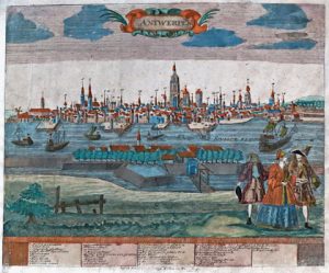(Anvers) - WOLFF, Peter.- Antwerpen. Nuremberg, Peter Wolff Erben, [c. 1730]. Gravure sur cuivre, TC 26,2 x 36,3 cm + marges, rehaussée à l'aquarelle (faiblement défraïchie).