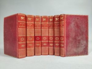 BEAUMARCHAIS Pierre-Augustin Caron de. OEuvres complètes. Paris, L. Collin, 1809 ; 7 vol. in-8, basane maroquinée grenat ancienne, filets dorés, dos lisses ornés de motifs dorés, tranches dorées, dos plus clairs. Portrait et nombreuses figures hors-texte élégamment gravées au trait.