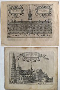 (Anvers) - Ens. 5 grav. in-4° - 3 vues tirées de Guicciardini (plan, vues de la cathédrale et de l'Hötel de ville), 2 vues panoramiques : depuis la "Tête de Flandre" extraite du Cantillon et 1 vue par Visscher (avec une vue de Bruxelles collée...