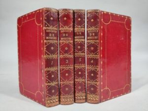 BOSSUET Jacques-Bénigne. Discours sur l'histoire universelle. Paris, Didot l'aîné, 1784 ; 4 volumes petit in-12, maroquin rouge de l'époque, décor de filets dorés, dos lisses ornés de motifs dorés, tranches dorées. Jolies reliures en dépit de dos légèrement brunis.