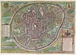 Plan à vol d'oiseau extrait du célèbre atlas "Civitates Orbis Terrarum" édité entre 1572 et 1618 avec la description de Bruxelles en allemand au verso (feuillet 15). Joint : "Bruxeles". Eau-forte, TC 8,3 x 12,2 cm servant d'illustration à l'ouvrage "Universus Terrarum orbis scriptorum calamo delineatus" par Lasor a Varea (Padoue, 1713).