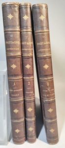 BRETAGNE CONTEMPORAINE, LA. Sites pittoresques, monuments, costumes, scènes de mœurs … Paris & Nantes, Charpentier, 1863-1867 ; 3 volumes in-4 demi-chagrin brun de l'époque, dos à nerfs ornés (décollement sur le premier plat du tome 1). Bel ouvrage accompagné de 167 planches hors-texte des plus remarquables monuments de la Bretagne, lithographiées d'après Felix Benoist. Texte par Aurélien de Courson, A. de la Borderie, P. de Courcy…