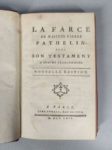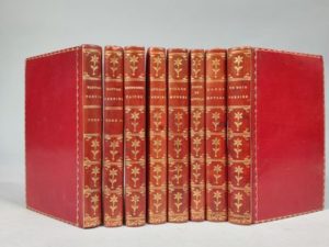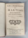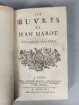 COLLECTION COUSTELIER DES ANCIENS POÈTES FRANÇAIS. Paris, 1723-1724,1762 ; 8 volumes in-12, reliures uniformes, maroquin ancien rouge, festons dorés, dos lisses ornés de motifs dorés, dentelle intérieure et tranches dorées. Collection publiée par Antoine Urbain Coustelier, imprimeur lettré, l'un des premiers à avoir édité ou à réédité des textes anciens oubliés ou inconnus. L'impression typographique est remarquable. Ch. Bourdigné, Legendre de Maistre, P. Faifeu. — G. Coquillart. Poésies. — G. Cretin. Poésies. — Farce de Maistre Pathelin (réédition de 1762). — Jean Marot. OEuvres. — Martial de Paris. Poésies (2 volumes). — François Villon. Il existe aussi dans cette collection un Racan en 2 volumes. Fraîches reliures uniformes.