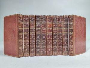 CORNEILLE Pierre. OEuvres. Paris, Bauche, 1758 ; 10 forts vol. in-12, reliures de l'époque maroquin rouge, filets dorés, dos lisses ornés de motifs dorés, tranches dorées. Reliures en maroquin bien conservées, même si le dos a légèrement bruni.