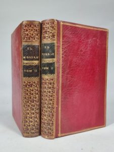CORSINI Bartolommeo. Il Torracchione desolato. Paris, Londres, M. Prault, 1768 ; 2 vol. in-12, maroquin rouge de l'époque, filets dorés, dos lisses entièrement dorés à la grotesque, pièces noires, tranches dorées. Portrait et 2 titres-frontispices de J. M. Moreau le jeune. Très jolies reliures parisiennes en maroquin de l'époque.