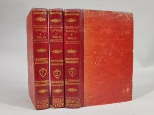 DEMOUSTIER Charles-Albert. Lettres à Émilie sur la mythologie. Paris, A.A. Renouard, 1801 ; 6 parties en 3 vol. in-8, demi-maroquin rouge du temps, dos lisses ornés de motifs dorés, auréole à la fin du tome II. Portrait et 36 figures hors-texte de C. Monnet.