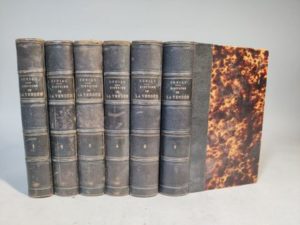 DENIAU Félix. Histoire de la Vendée d'après des documents nouveaux et inédits. Angers, Lachèse et Dolbeau, 1878 ; 6 vol. in-8 demi-chagrin brun de l'époque, dos à nerfs. Édition originale illustrée de cartes et de Plans (deux de ceux-ci coupés mais complets).