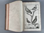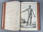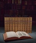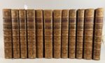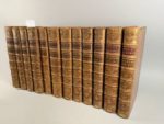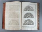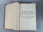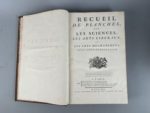 DIDEROT Denis, Jean Le Rond d'ALEMBERT. Encyclopédie ou Dictionnaire… Recueil de planches sur les sciences, les arts libéraux et les arts méchaniques, avec leur explication. Paris, Briasson ; David ; Le Breton ; Durand, 1762-1777 ; 12 forts vol. in-folio, reliures uniformes de l'époque veau clair marbré, dos à six nerfs ornés de motifs dorés, pièces rouges, écorchures à quelques coiffes. COLLECTION COMPLÈTE DES 12 VOLUMES DE PLANCHES DE « L'ENCYCLOPÉDIE », soit 2810 estampes gravées sur cuivre comptées pour 3130 à cause des doubles (307) et des tripes ou quadruples (13). Sous la direction de Jacques-Renaud Bénard, une équipe de dessinateurs et de graveurs — L. J. Goussier, J. Lucotte, F. Martinet, Pierre Soubeyran — se rendirent sur les sites et dans les ateliers pour fixer les machines, les instruments et les artisans eux-mêmes en représentations exactes et souvent fort jolies. Par ses tendances novatrices et son bilan monumental l'Encyclopédie a jeté les bases des grandes découvertes scientifiques des siècles suivants. La plupart des Avis aux relieurs ont été conservés. Par inadvertance le 9e volume est tomé 10 et le 10e, 11e et dernier. Quelques légères traces d'eau au tome VI. Jolies et solides reliures uniformes d'origine en veau clair.