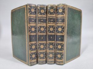 FÉNELON François de Salignac de la Mothe-. Les aventures de Télémaque, fils d'Ulysse. Paris, P. Didot l'aîné, 1796 ; 4 vol. in-16 maroquin vert de l'époque, petite dentelle sur les plats, dos lisses ornés de motifs dorés. Portrait et 24 figures hors-texte de Queverdo.