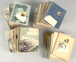 GADEAU DE KERVILLE Henri. Réunion de 24 ouvrages tirés à petit nombre sur beau papier pour être offerts à des proches au Nouvel An. Rouen, Impr. J. Lecerf, 1889-1914 ; 24 volumes petit in-8 brochés. Personnage singulier, Gadeau de Kerville (Rouen, 1858-1940) était botaniste, zoologiste, archéologue, poète, moraliste, voyageur, photographe et amateur d'art. Ces volumes contiennent des maximes morales, des poésies, des relations de voyages, des études sur les arbres et les animaux, etc., etc. Les recueils s'intitulent, Mélania, Tunisiana et Algeriana, Syriaca, Aurora, Germanica, Pyrenea, Austriaca, Lemanica, Ægyptia, Arverna… Un très grand nombre de photographies les illustrent. Tous portent une dédicace de l'auteur à ses cousins Georges et Adrienne Lefèbvre. Collection probablement unique. - Joints : 8 volumes en double également dédicacés. - Ensemble, 32 volumes.