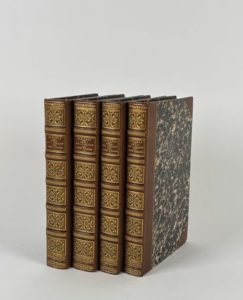 GOBINEAU Arthur de. Essai sur l'inégalité des races humaines. Paris, Firmin Didot frères, 1853-1855. 4 volumes in-8 demi-maroquin havane à coins, filet doré, dos à nerfs ornés de motifs dorés (Noulhac). Édition originale de l'œuvre majeure de Gobineau. Dès les premiers mots de l'ouvrage il laisse entendre son propos : « La chute des civilisations est le plus frappant et en même temps le plus obscur de tous les phénomènes de l'histoire ».