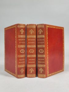 GOLDONI Carlo. Memorie, scritte da lui medesimo. Venise, Antonio, Zatta e figli, 1788 ; 3 forts vol. petit in-8, reliures anciennes maroquin rouge, petite dentelle dorée sur les plats, dos lisses ornés de motifs dorés, dentelle intérieure et tranches dorées. Portrait et jolie vignette de titre répétée, le tout gravé sur cuivre. Fraîches reliures anciennes en maroquin.