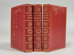 LA BRUYÈRE Jean de. OEuvres. Paris, Ménard et Desenne fils, 1818 ; 3 vol. in-16, basane maroquinée rouge ancienne présentant quelques usures, festons dorés, dos lisses ornés de motifs dorés, tranches dorées. — Portrait gravé.