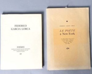 LORCA Federico Garcia. Le poète à New York. Avec l'Ode à F.G. Lorca de Pablo Neruda. Paris, GLM, 1948 ; in-4 broché. Traduction de Guy Lévis Mano ornée de dessins de F.G. Lorca. - Papier d'Alfama. - Joint du même : POÈMES CHOISIS et traduits par Guy Levis Mano avec le texte espagnol et des dessins de Lorca. Ibid, id., 1969 ; in-4 broché. - Papier vergé du Marais. - Joint : JAMMES Francis. Pomme d'Anis. Récit. Paris, Émile-Paul frères, 1923 ; petit in-4 broché. - Édition ornée de 6 burins originaux hors-texte de Valentine Hugo. - Papier vélin de Hollande. - Ensemble 3 volumes.