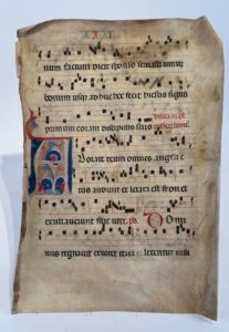 MANUSCRIT. — Feuille d'antiphonaire in-folio sur peau de vélin avec texte calligraphié et …