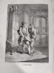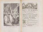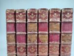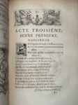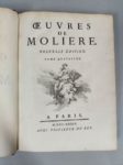 MOLIÈRE. OEuvres. Paris. 1734 ; 6 forts vol. in-4, reliures de l'époque maroquin rouge, filets dorés et fleuron aux angles sur les plats, dos à nerfs ornés de motifs dorés, dentelle intérieure et tranches dorées. « Le chef-d'œuvre de Boucher comme illustration. » (Cohen) : Portrait d'après Coypel, fleuron de titre, le même pour tous les volumes, et 32 (sur 33) figures hors-texte de François Boucher. Il manque une figure au tome V et six pièces de titre ou de tomaison (sur douze). Mais l'exemplaire est dans de MAGNIFIQUES RELIURES EN MAROQUIN ROUGE DUES PEUT-ÊTRE À JACQUES-ANTOINE DEROME.