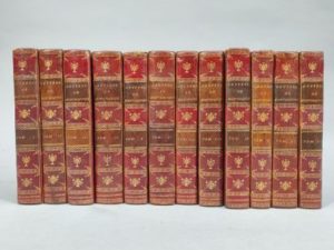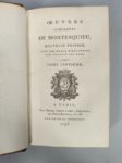 MONTESQUIEU Charles de Secondat de la Brède de. OEuvres complètes avec notes d'Helvétius. Paris, Didot l'aîné, 1795 ; 12 vol. in-12, maroquin rouge de l'époque, filets dorés, dos lisses ornés de motifs dorés, pièces vertes, tranches dorées, un mors légèrement frotté. Collection bien reliée.