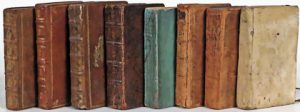 (Almanach) - Den grooten Brugschen comptoir almanach [...]. Brugge, Joseph De Busscher, 1771 [- 1792]. 8 vol. in-12°. Eigentijdse banden in verschillende materialen (waaronder 2 wapenbanden) : 6 in leder, 1 in perkament en 1 in papier (5 lederen...